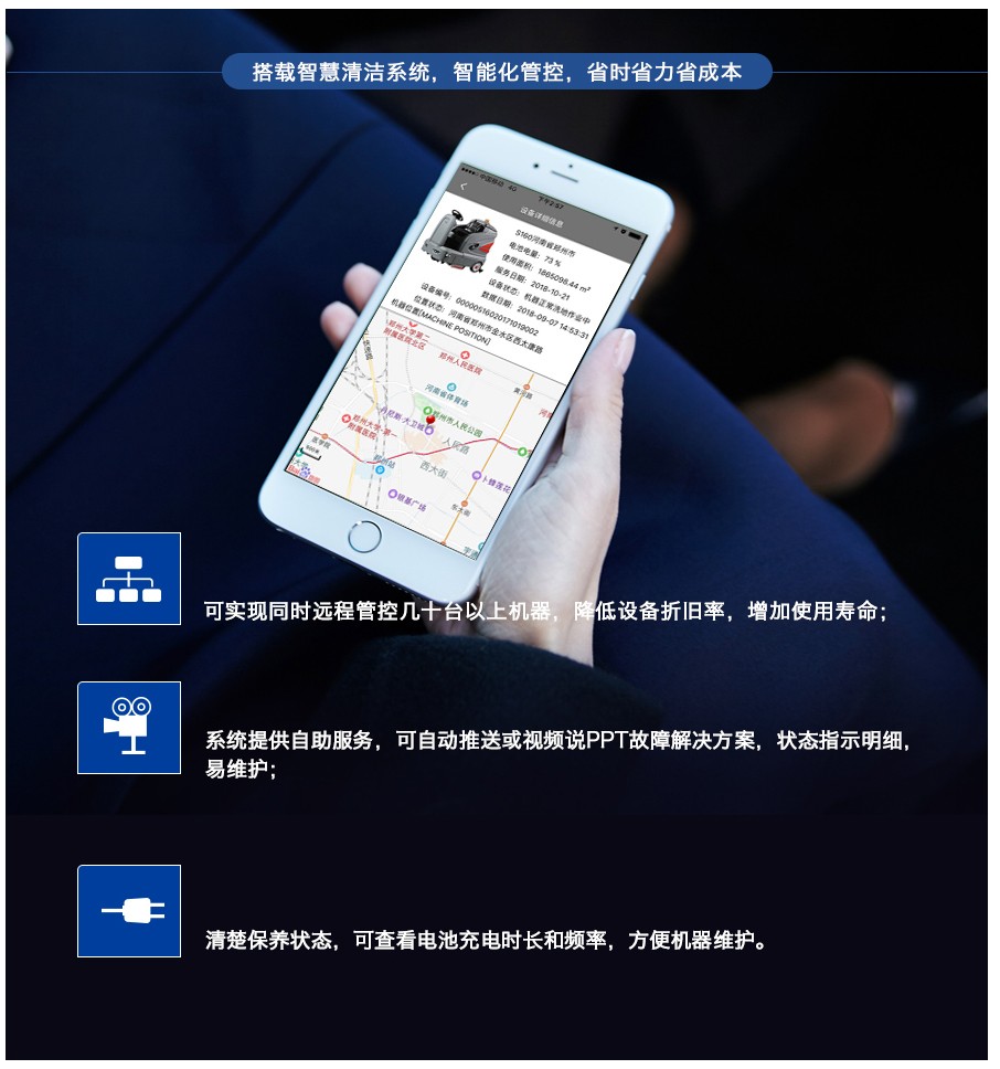 用途:S160智慧型洗地車,智慧機型,效率典范,中大面積場所的適配機型。適用于所有硬地面清潔,每小時工作效率6800平方米,快速清潔,提高工作效率。